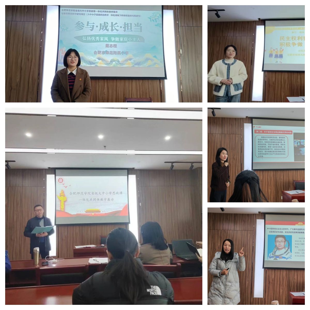 在教学展示阶段,以“参与、成长、担当”为主题,以人的社会化为主线,来自合肥师范学院的季梦婷、合肥一中的王璐、合肥市杨使兵名师工作室的杜钰彤和合肥师范附小的戴志程等不同学段4位思政课教师,在前期集体备课磨课基础上,较好地展示了共同体教师过硬的教学能力。合肥市教育科学研究院侯新旺老师、合肥师范学院傅文茹老师做了精彩点评,认为共同体教学展示活动加增进了不同学段老师的交流学习,对于共同体思政课教学效果的提升,推动教师一体化的发展都具有极大的促进作用。(亚洲视频一区二区:周继祥)