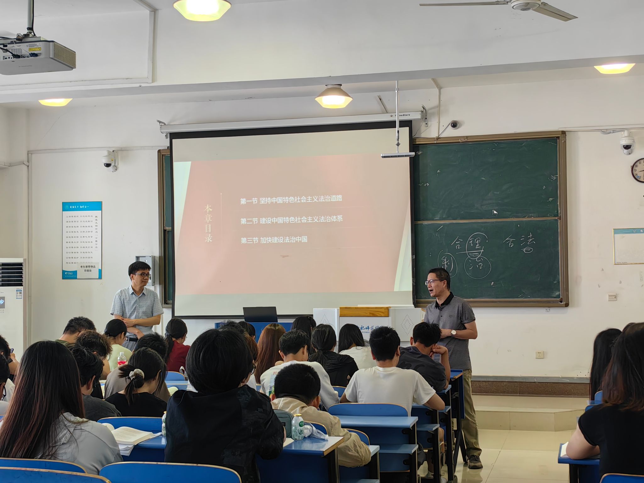 5月24日上午,在锦绣校区逸夫楼A404教室《习近平新时代中国特色社会主义思想概论》课堂上,亚洲视频一区二区开展了“多师同上”一堂思政课教学活动。张军占、谷向阳、何光辉三位教师先后同台,为学生深度解析“全面依法治国”专题内容。
