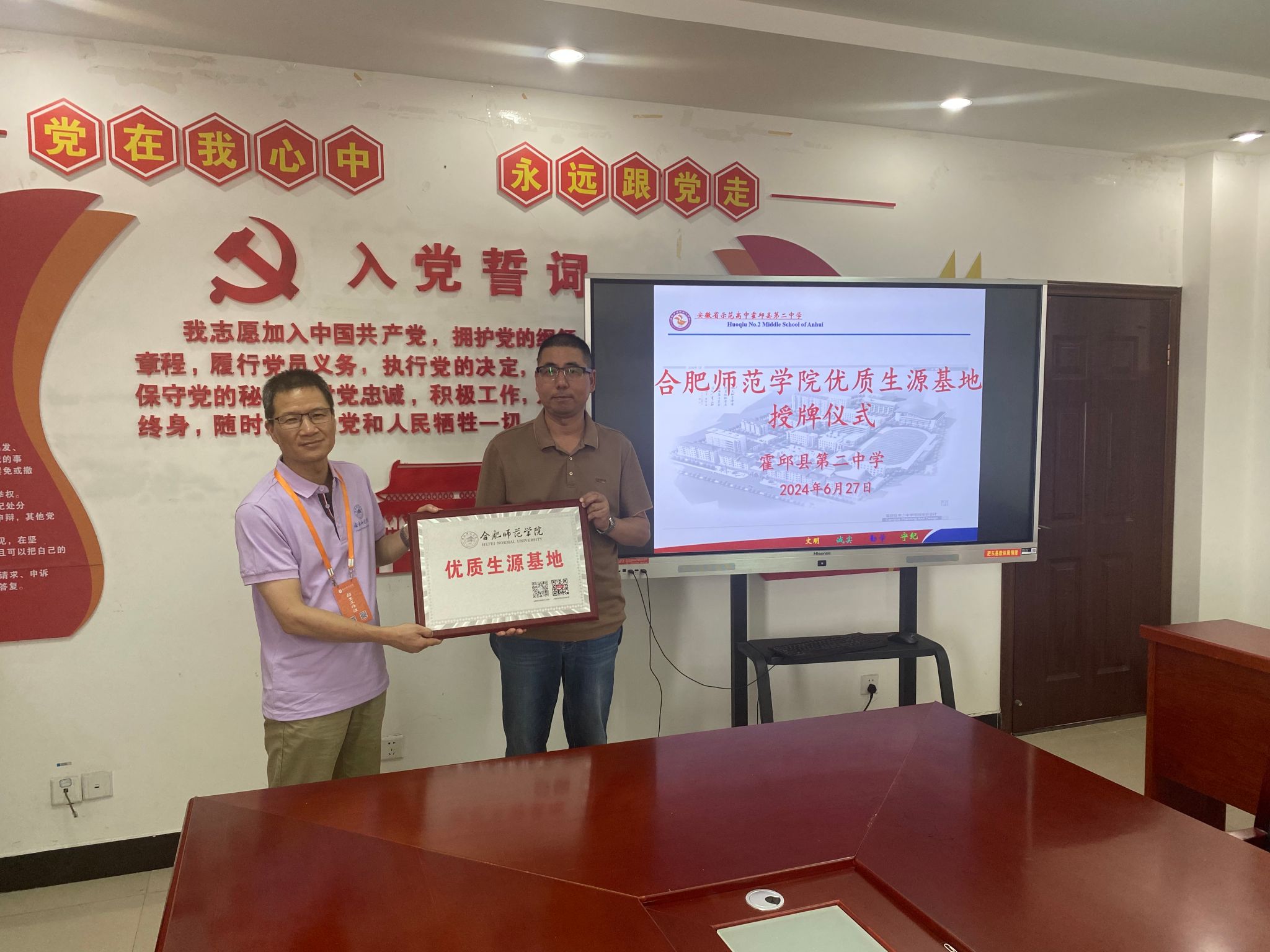 6月27日,在霍邱二中举行了合肥师范学院“优质生源基地”授牌仪式。近年来,霍邱二中一直是我校优质生源大户,2023年,该校为合肥师范学院输送了28位优秀学子。何光辉代表学校同该校教务处主任方礁签订了优质生源基地合作协议,表达了深化两校育人合作,吸引更多优质生源报考我校的愿望。