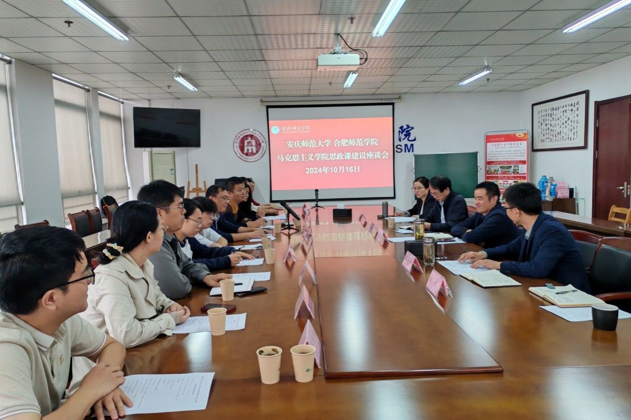 10月16日上午,安庆师范大学亚洲视频一区二区副院长余江舟、习近平新时代中国特色社会主义思想概论教研室主任陈道发等一行10人来学院调研,围绕思政课建设进行座谈交流。学院党总支副书记吴世红、副院长方政、习近平新时代中国特色社会主义思想概论教研室主任张军占、形势与政策教研室主任吴石英等参加交流。方政主持座谈交流。