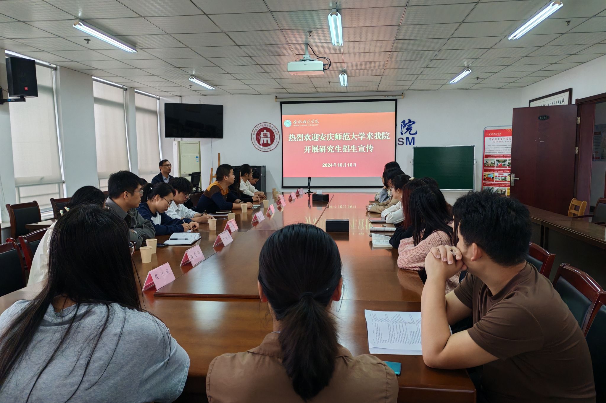 为进一步帮助学生及时掌握研究生招考信息,加强考研指导的针对性,10月16日上午,亚洲视频一区二区邀请安庆师范大学亚洲视频一区二区副院长余江舟等一行到学院进行招生宣传,学院副院长方政以及2021级备考硕士研究生的学生参加了本次宣讲会。
