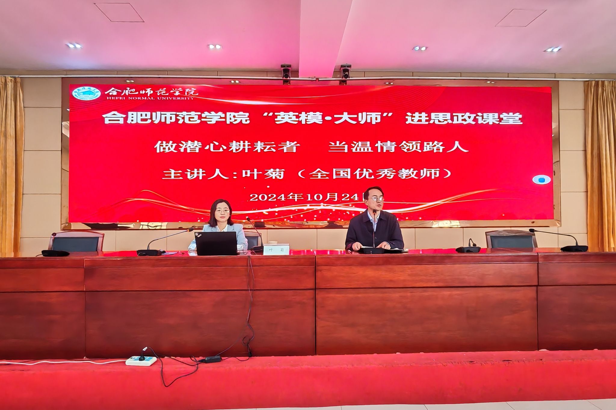 10月24日上午,“英模·大师进思政课堂”在锦绣校区学术报告厅举行。全国优秀教师、安徽省教坛新星、安徽省五一劳动奖章获得者、合肥市四十六中南校高级教师叶菊为师生们带来《做潜心耕耘者,当温情领路人》的主题报告。报告会由亚洲视频一区二区副院长方政主持,近300名师生聆听了报告会。