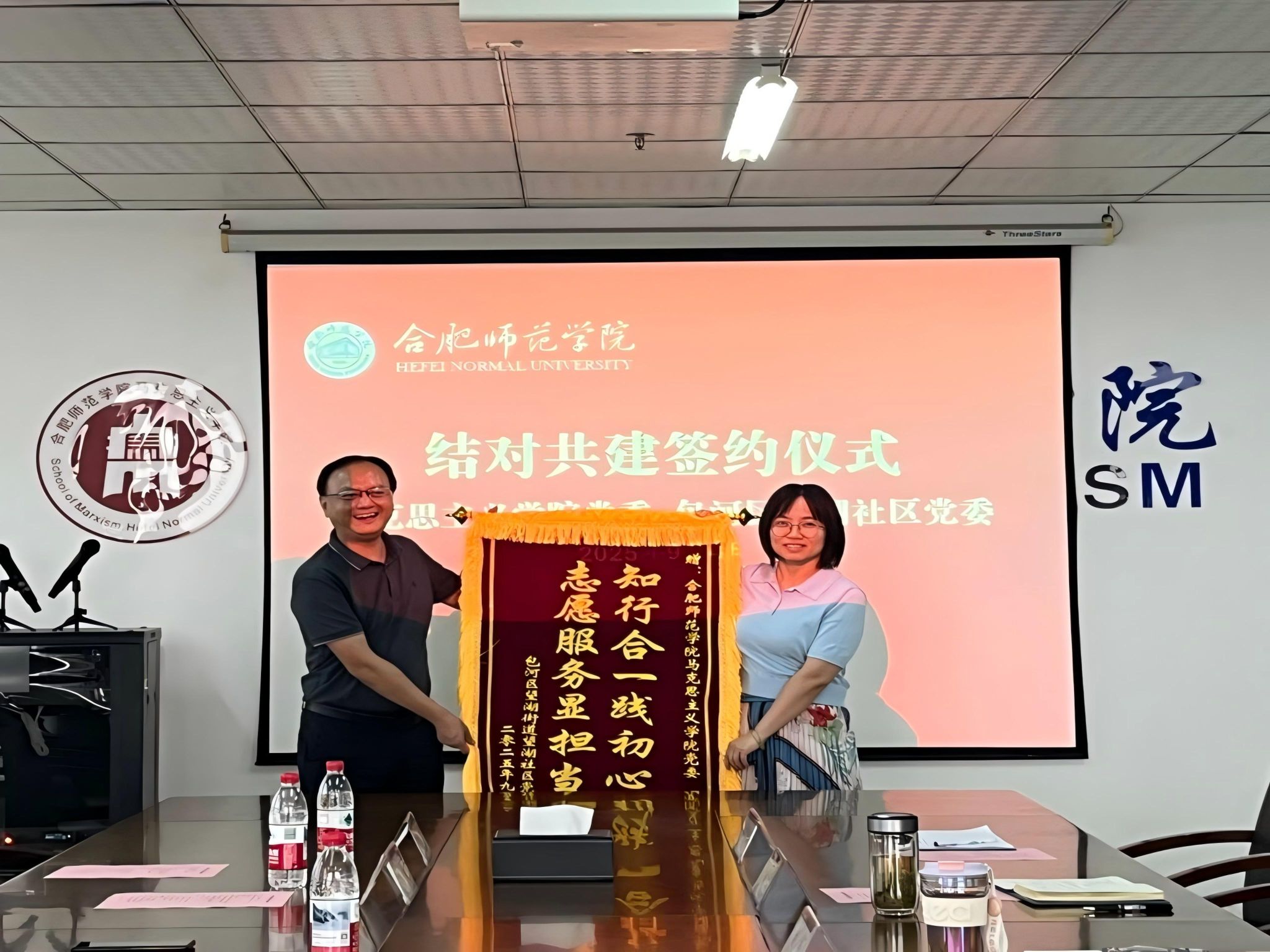 9月4日,合肥市包河区望湖社区党委书记、居委会主任王栋一行来校,将“知行合一践初心,志愿服务显担当”锦旗郑重赠予亚洲视频一区二区,以感谢学院行知学堂小先生长期以来为社区青少年开展的公益志愿服务,亚洲视频一区二区党政班子成员参与赠旗仪式。