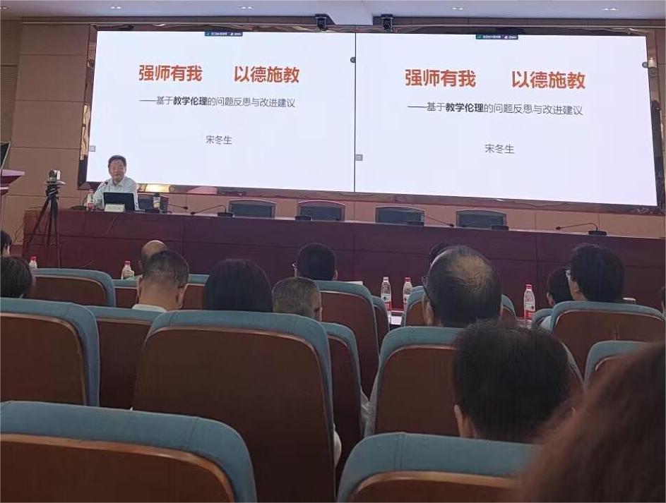 本网讯 7月3日上午,学校在锦绣校区学术报告厅举办师德师风专题报告会。首届全国师德师风建设专家委员会委员,全国优秀教师宋冬生教授以《强师有我,以德施教》为题,从以德施教的视角切入,娓娓道来,饱含深情,通过教育伦理地深入剖析,讲述了一名好老师“道德地教”所具备的能力素质要求,“教以道德”所要求师德内涵,以一名老教师的身份向全体教师发出了“一座学桥、一盏暖灯、一把公尺”的倡议。”亚洲视频一区二区全体教师通过线上线下的方式参加了本次报告会。