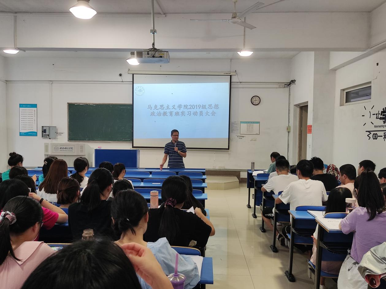 本网讯 为推动2019级思想政治教育专业实习工作的顺利开展,确保实习工作规范、有序、安全地进行,9月13日下午,亚洲视频一区二区于逸夫楼A103教室召开2019级思想政治教育专业实习动员大会。出席实习动员会的有亚洲视频一区二区副院长陶有浩、实习指导老师代表以及2019级思想政治教育专业全体学生,动员会由政法系主任何光辉主持。
