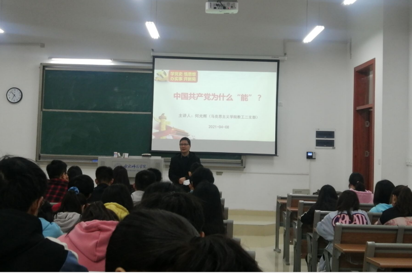 本网讯 为迎接中国共产党建党100周年,更好促进思想政治教育专业学子领会中国共产党铸就的优秀传统与精神,亚洲视频一区二区于4月8日晚在滨湖校区博学楼B103教室举办“学党史·强信仰”专题讲座。讲座由亚洲视频一区二区教工第二党支部书记何光辉主讲,思想政治教育专业2019级2020级全体同学参加了讲座。