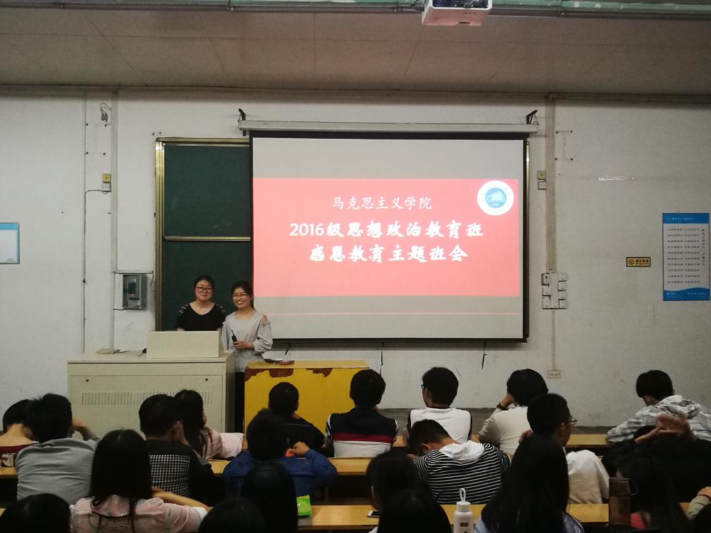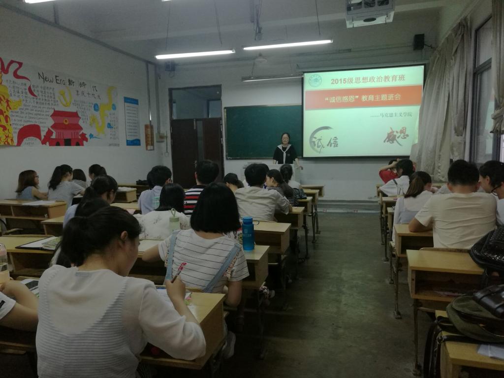 学生工作 当前位置: 主页 >> 学生工作 >> 正文 我院学生召开诚信感恩主题班会 发布日期:2018-05-21 编辑:亚洲视频一区二区 核稿: 点击: 本网讯5月18日,我院2015级思想政治教育班、2016级思想政治教育班和2017级思想政治教育班分别在三孝口校区教学楼教室102、西阶教室和307教室举行了以“诚信与感恩”为主题的主题班会。 班会上,着重强调了诚信、感恩的现实重要性,做人做事要诚信,对于帮助过我们的国家、学校和他人更要要心存感恩,要勇于担当,用实际行动来报答“滴水之恩”。 本次三个班的班会旨在增强学生们的感恩之心,要求学生们做到诚信之行。通过此次班会,同学们切实提高了自身诚信、感恩的社会责任意识。(政法系)