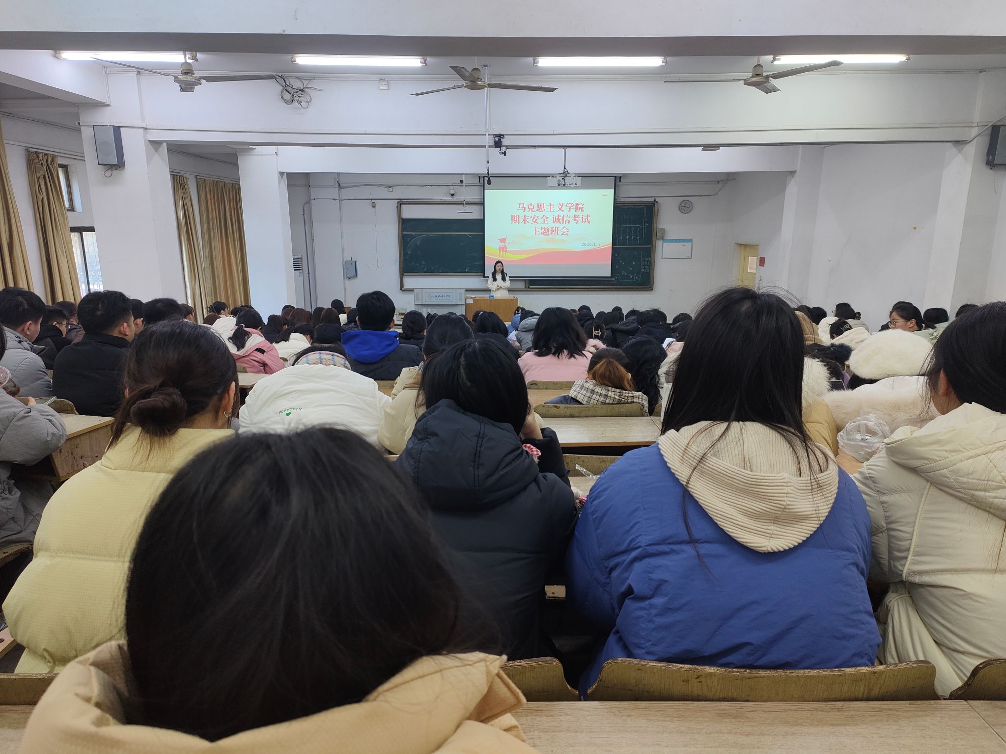 为提高学生的安全防范意识,同时进一步加强学风建设,增强学生的诚信意识,亚洲视频一区二区于2023年12月27日在滨湖校区铭传楼A309教室、2024年1月5日在锦绣校区博约楼111教室,面向全体学生召开期末安全和诚信考试主题班会,会议由辅导员王萌主持。