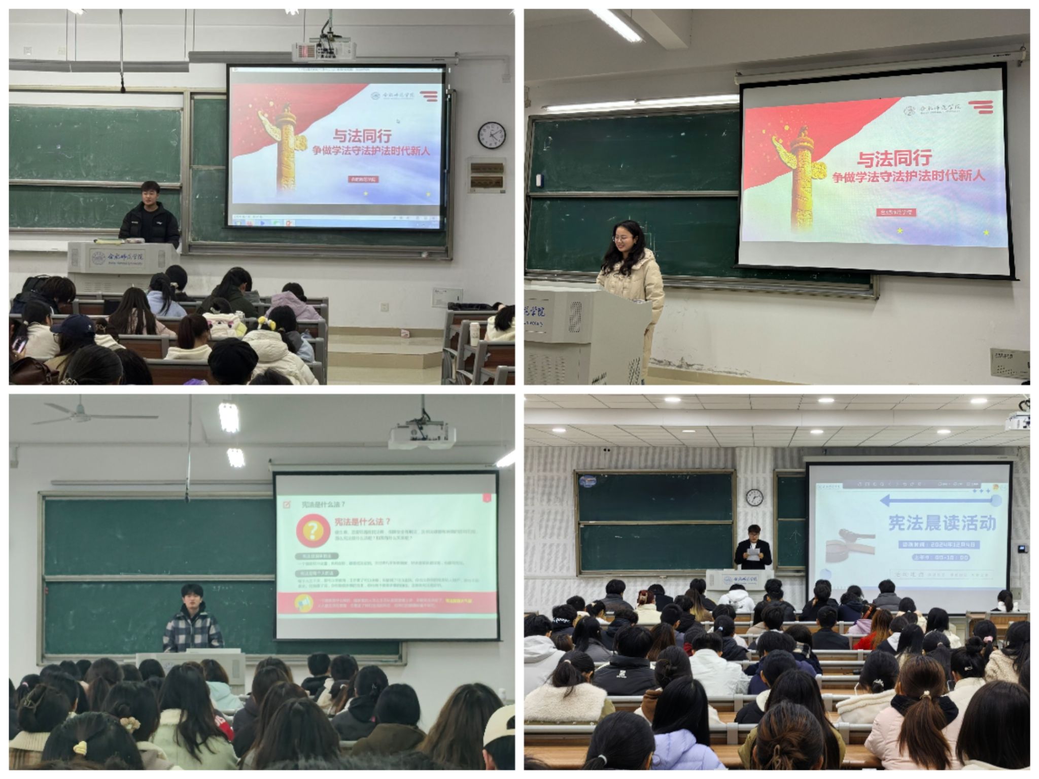 12月3日-4日,学院各班级开展“与法同行,争做学法守法护法时代新人”主题班会,班会围绕宪法的重要作用、宪法重点内容解读、保障宪法实施等三个方面展开,深入浅出,引导青年大学生学法、知法、懂法、守法,让法治意识入脑入心入行。宪法主题班会的开展,使学生们深刻认识到作为新时代青年大学生,肩负着捍卫宪法尊严、保障宪法实施的责任与义务。