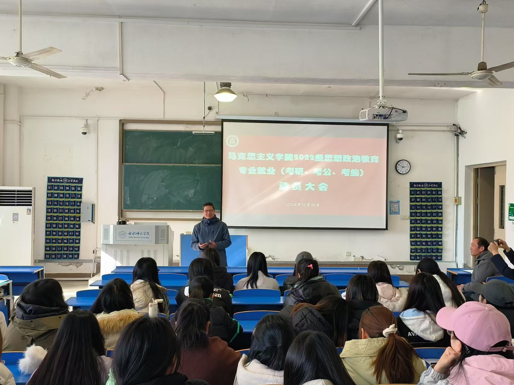 为全面推进学院2022级思想政治教育专业就业工作,引导学生树立正确的就业观念,提高就业积极性和主动性,12月30日上午,亚洲视频一区二区在逸夫楼A105教室召开2022级思想政治教育专业就业(考研、考公、考编)动员大会。亚洲视频一区二区院长何光辉出席会议,2022级思想政治教育专业全体学生参加会议。