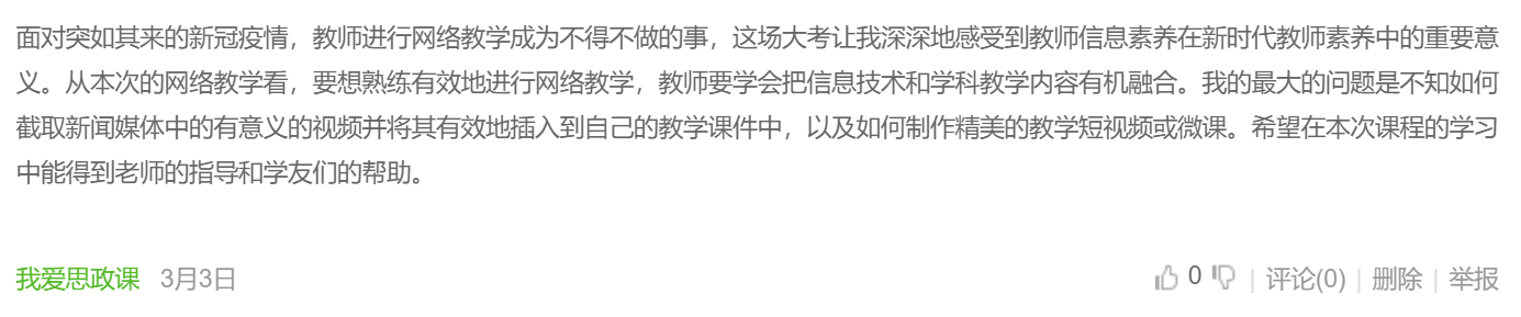 在三周以来的网络教学中,尽管我很认真地备课和上课,但是深感自己的信息技术素养严重不足,为了让自己能在教学中能够应付自如,我一边实施网络教学,一边抓紧利用网络平台学习课程建设和具体课件制作,通过中国大学MOOC平台,我参与了武汉大学丁俊萍教授领衔建设的“概论”国家级精品课程和首都师范大学孙众副教授领衔的《教师信息技术应用能力提升》课程的学习,从学习武大的精品课程中,我知道在设置作业时可以允许学生做三次以其中最高成绩作为有效成绩比只让学生做一次作业就计算成绩要好,通过学习首师大的信息技术课程,我深感新时代教师的数字素养提升的必要性和紧迫性,在今天的思政课教学中,我们要特别思考如何进行信息技术和思政课程的“融合创新”,如何在思政课中运用技术突出学生主体。