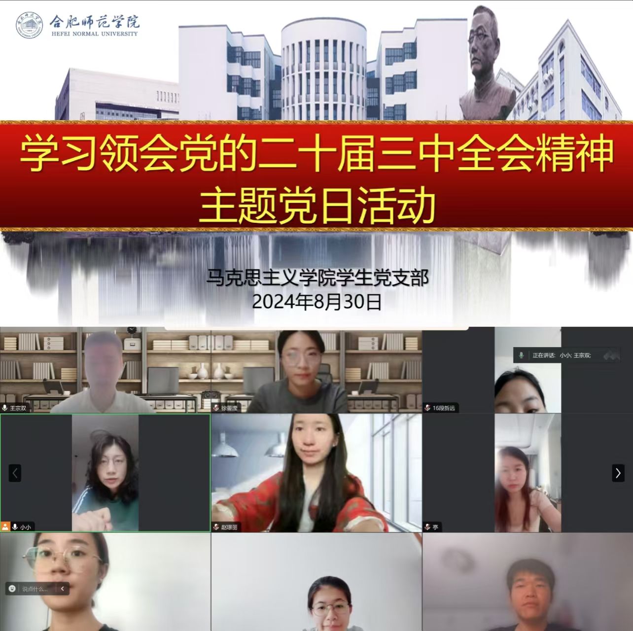 为深入学习领会党的二十届三中全会精神,8月30日上午,学生党支部通过线上会议形式,集体学习了党的二十届三中全会精神。本次会议由支部委员王宗双老师主持,支部书记王潇老师作会议总结,支部全体党员参加。