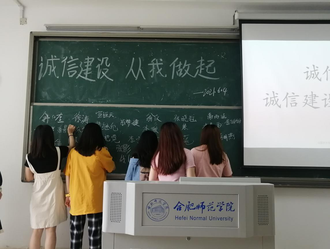 活动伊始,陈玉钊对“人之所助也,信也”这句名言进行诵读与解释,并对国家开发银行生源地信用助学贷款的相关流程以及还款方式等各方面进行详细的介绍,同学们对于国家资助贷款有了进一步的了解。为了使同学们对于诚信有更为直观明了的认识,本次活动的第二个环节采取同学们一同观看诚信短视频的方式,短片中所弘扬的诚信精神鼓舞了在场的每一位人。紧接着,同学们对于何为诚信、如何守住诚信等话题展开了激烈的讨论。其中舒仁奎同学说道:“诚信就是信守承诺、守信用,我们在日常生活中需要坚守自我,始终践行诚实守信的准则。”部分同学还向大家分享了身边的诚信小故事,为本次活动增添了一抹亮色。通过讲解与讨论,同学们对于诚信由了更为清楚的认识,同学们在陈玉钊同学的带领下进行了诚信宣誓,坚定了同学们在今后践行诚实守信的原则。最终,本次活动以同学们逐一在诚信黑板墙上签名的形式结束。资助诚信教育主题班会让大家认识到了诚信的重要性,帮助同学们进一步养成诚信的良好道德品质。