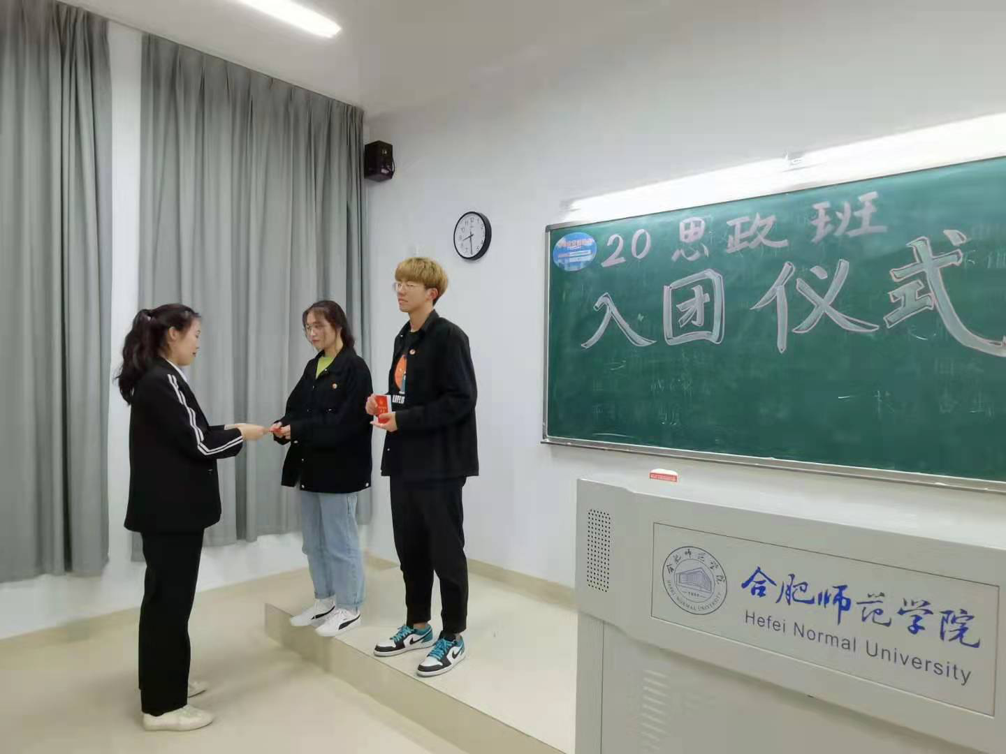 在庄严的国歌声和团歌声中本次新团员入团宣誓仪式正式开始,20级团支书周越宣读新团员的名单,本期共有宋俊杰和杨洁两位同学加入团组织。随后周越为新团员佩戴团徽。在主持人计大宇的领誓下,各位新团员面向团旗、右手握拳举过肩,在团旗下庄严宣誓“我志愿加入中国共产主义青年团,坚决拥护中国共产党的领导,遵守团的章程,执行团的决议,履行团员的义务…”宣誓完毕后,由新老团员分别上台发言,新团员宋俊杰表示自己要立志做一名优秀的共青团员,努力学习,做品学兼优的好学生,以优异的成绩回报老师、回报学校、回报祖国、回报社会。