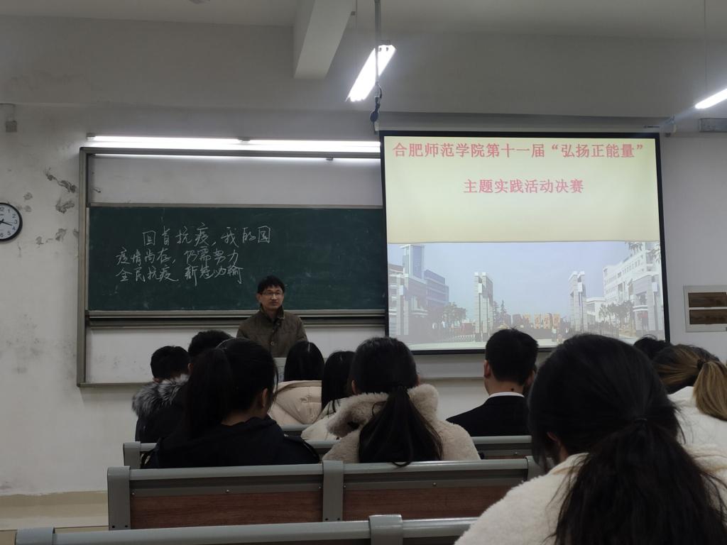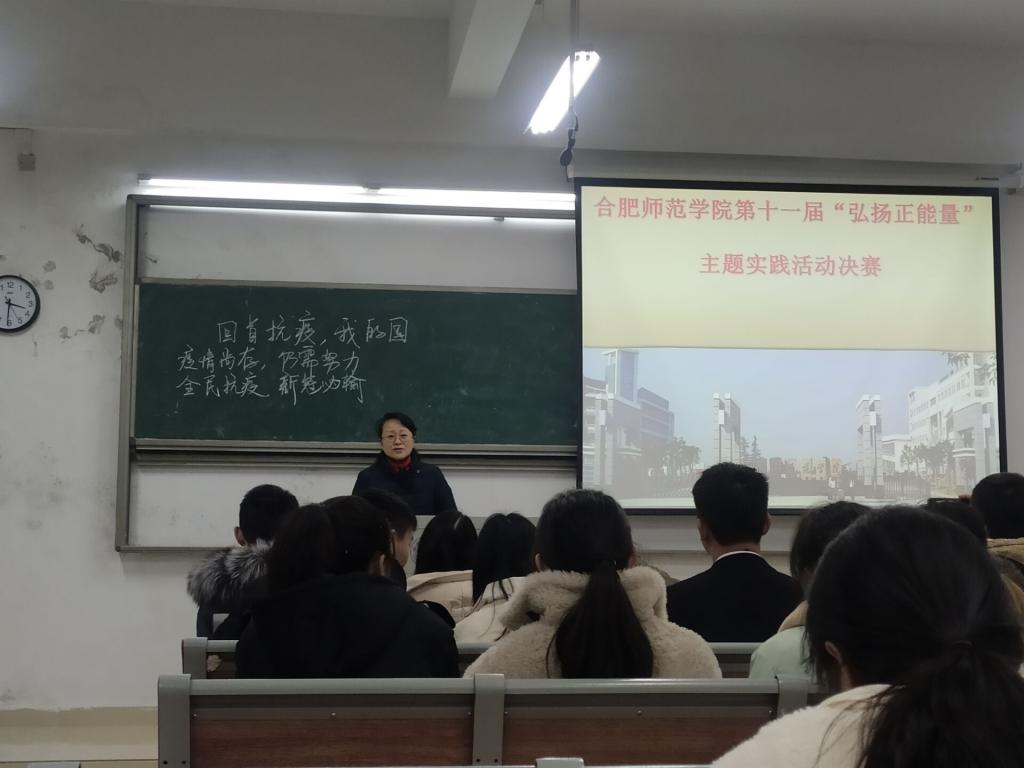 本网讯为了贯彻落实全国高校思想政治工作会议精神和习近平总书记“3.18”重要讲话精神,推进思想政治理论课教学改革,12月9日下午,以“抗疫:我眼中的中国”为主题的合肥师范学院学院思想政治理论课第十一届“弘扬正能量”主题实践活动决赛在滨湖校区博学楼A206教室举行。本次活动由就业创业工作处、教务处、团委、宣传部以及亚洲视频一区二区等单位负责人担任评委。